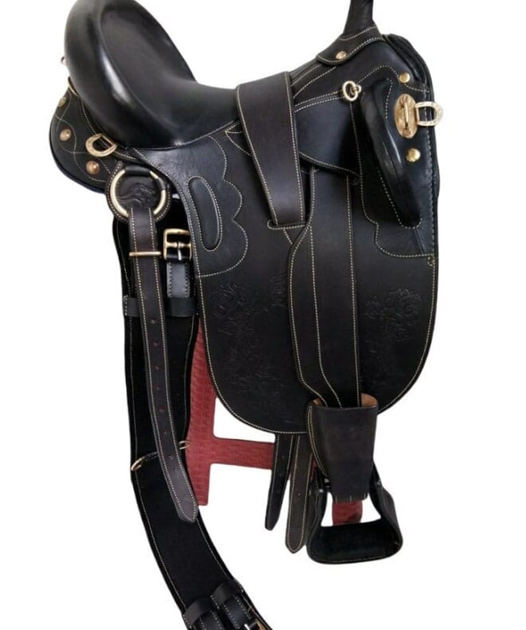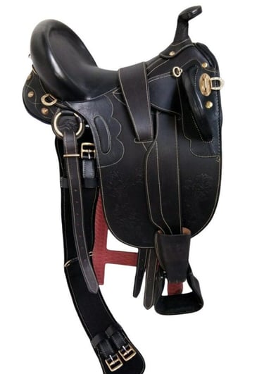 A Western leather saddle is a robust and comfortable saddle designed for long hours of riding, especially in ranching and trail environments. Crafted from high-quality leather, it features a deep seat, high cantle, and prominent horn, offering excellent support and control for the rider. Its design distributes weight evenly across the horse’s back, making it ideal for working horses. Decorative tooling and durable construction make Western saddles both functional and visually appealing.